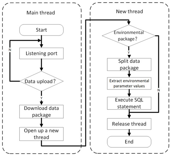 The terminal node packages the data in a certain format and uses socket technology to send messages to the specific IP address and port number of the poultry house server. When the data information is successfully sent to the server in the poultry house, the server program downloads the data packet from the monitored port; then, it uses the specified transmission format to split the information, and it executes the corresponding SQL statement according to the type of data to upload the data to the cloud database; the data processing flow chart is shown in Figure 6.