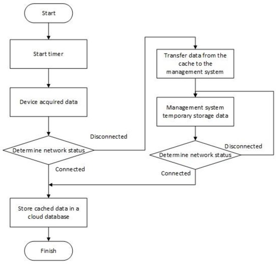 Since there are many data transmission devices placed in the poultry house, it is necessary to set a routing node in the poultry house to forward the network data package to the cloud database. Taking into account the problem of network fluctuations, the server in the house may be disconnected from the cloud database, and the data information generated in the poultry house has real-time and continuous characteristics, so a data protection program must be designed to prevent data loss information. Figure 7 shows the local transmission strategy of the routing node, taking into account the network factors such that the system data security is improved.