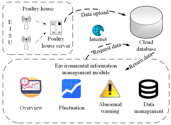 The business process diagram of this module is shown in Figure 9. The EISUs upload the collected environmental information to the cloud database through the poultry house server. The cloud database is responsible for storing and managing the information. The environmental information management module makes active requests, queries the cloud database, and then display the feedback data through this module, so as to realize the management function of environmental information in the poultry house. The software interface effect of this module is shown in Figure 10.