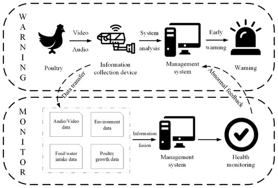 The existing research foundation can be used to realize the detection function of poultry disease. On this basis, combined with the related work of this management system (poultry house environmental monitoring, poultry growth information monitoring, and diet and water consumption monitoring), it can further realize the function of monitoring the health status of poultry. The principle diagram of the method of monitoring the health status of poultry and early warning of disease is shown in Figure 11.