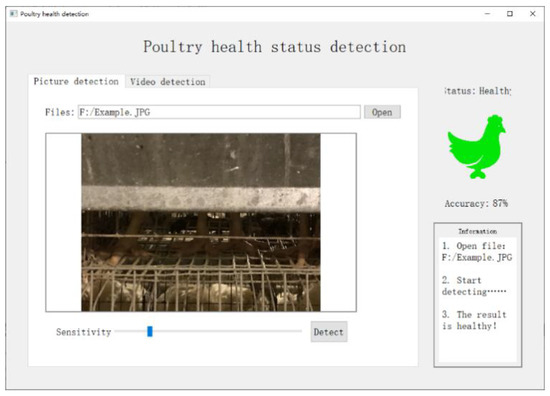 The software interface implemented by the disease detection function is shown in Figure 12. The poultry pictures and video content are used to monitor the health of the poultry. The detection principle and method are mainly to extract the features of the area to be detected under the food trough in the image, and they use the deep learning method to analyze and calculate the behavior of the chickens in the feature area and then judge the health of the chickens.