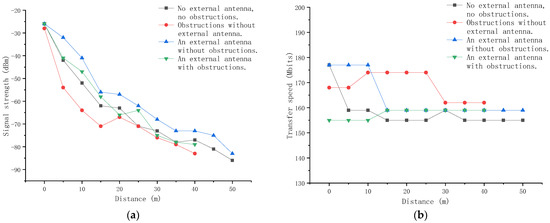 The test results of the environmental information sensing unit: (a) signal strength; (b) transmission rate.
