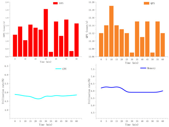 Figure 15 provides a more intuitive understanding of the operating status of the cloud database. During this period of time, the number of input/output operations per second (IOPS) of the cloud database was basically maintained at about 1.5, and the number of queries per second (QPS) remained above 13, but the utilization of the central processing unit (CPU) and memory has been maintained at a relatively low level (CPU utilization rate is 4.6–4.9%, memory utilization rate is 5.9–6.3%). It can be seen that the operation of the cloud database is stress-free under the experimental conditions, and the normal use of the system can be guaranteed.