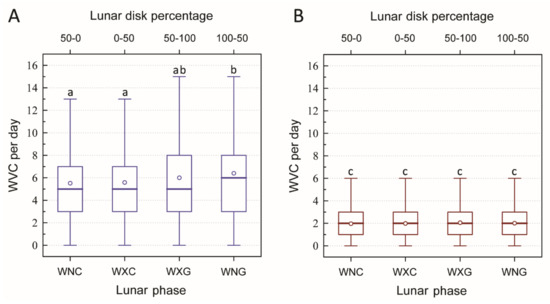 Wildlife–vehicle collisions (WVCs) per day during different lunar phases. (A) = dark period (night—sunset to sunrise); (B) = light period (day—sunrise to sunset). Lunar phases are arranged by the percentage of lunar disc: waning crescent (WNC), waxing crescent (WXC), waxing gibbous (WXG), and waning gibbous (WNG). Thick lines indicate medians, open circles indicate means, boxes indicate inter quartile ranges, and whiskers indicate non-outlier ranges. Lowercase letters (above the whiskers) indicate statistical significance (Mann–Whitney U test (p < 0.05))—phases with the same letter are not statistically different from each other, while phases with different letters are statistically significant from each other.