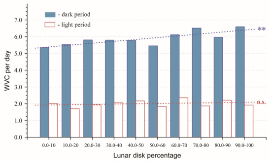 Average wildlife–vehicle collisions (WVCs) per day for 10% interval lunar disk percentages. Filled columns = dark period (night—sunset to sunrise); open columns = light period (day—sunrise to sunset). Asterisks indicate significant trendline (rs = 0.79; p = 0.006). n.s. = non-significant.
