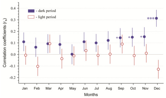 Spearman’s correlation coefficients between wildlife–vehicle collisions (WVCs) and lunar disk percentages (LDPs) during 2014–2018 in Lithuania. Closed circles indicate correlation coefficients between WVCs and LPD that occurred during the dark period (night), while open circles indicate correlation coefficients between WVCs and LDP during the light period (day). Whiskers indicate Std. errors based on 10,000 bootstrap replicates. *** indicates p < 0.001, and + indicates one-tailed significance; p < 0.05.