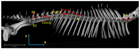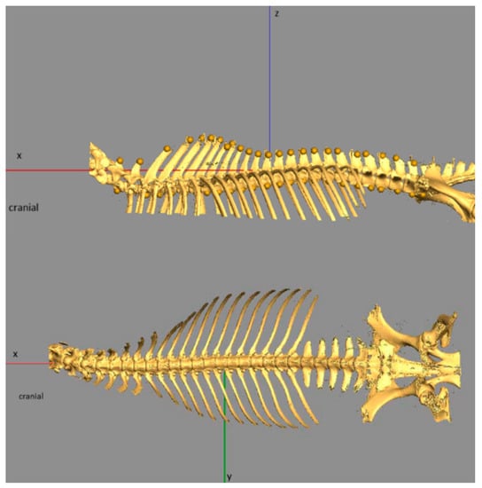 For establishing this standardised coordinate system, we used a set of reference points dorsal to the spinous processes and ventral on the ventral crest of the body of each thoracic and lumbar vertebra. From this point cloud, the three principal axes were calculated. The x-axis was defined as the cranio-caudal axis, the y-axis as the left–right axis and the z-axis as the dorsoventral axis (see Figure 1).