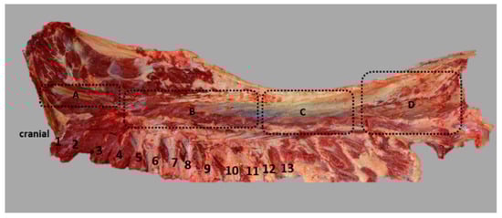 Left lateral view of a freshly dissected horse back. Neck region removed cranial to the 6th vertebra, thoracic and abdominal wall reduced to most dorsal aspects, hind limbs exarticulated and tail removed. The thoracolumbar longissimus dorsi muscle (LG) is exposed after removing skin, fat and overlying muscles. Ribs are numbered cranial to caudal (numbers 1–13). The thoracolumbar LG was divided macroscopically into compartments A–D. Compartment A describes the most cranial part of the muscle inserted at the last cervical vertebrae, followed by compartment B which overlaps compartment A in the cranial part at the height of the 4th rib. The caudal part of compartment B reaches to the height of the 13th rib. Compartment C comes right behind compartment B and reaches from the height of the 13th rib to the impression of the removed Musculus gluteus medius. Compartment C is followed by compartment D, which is the most caudal part of the muscle, becoming visible after removing the gluteus medius muscle. Compartment D is the most caudal part of the muscle that is in close contact with the gluteus medius muscle, as it inserts at the aponeurosis of the LG. It has a slim dorsal muscle belly that originates at the dorsal processes of the sacrum and a ventral flat portion, which runs from the iliac crest.