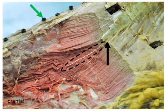 Left cranio-lateral view of a formalin-fixed horseback, showing the partly dissected lumbar LG at the height of the 16th rib (compartment C). The green arrow is pointing at a screw drilled into the spinous process of the 15th thoracic vertebra, serving as a reference point during computed tomography (CT) scan and digitisation process. Muscle layers have been ablated from cranial to caudal to expose MFB from their origin to the insertion. The strong aponeurosis releases a fascia (black arrow) that divides the muscle partly into a supra- and subfascial belly.