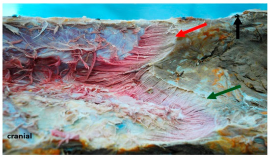 Left cranio-lateral view of a formalin-fixed horseback, showing the partly dissected lumbar LG in compartment D. The red arrow is pointing at the slim dorsal muscle belly that originates at the dorsal processes of the sacrum. The green arrow points at the flat ventral muscle portion running from the iliac crest. Muscle layers have been removed from cranial to caudal to expose fascicles from their origin to the insertion. The screw that is drilled into the dorsal process of the sacrum (black arrow) served as a reference point.