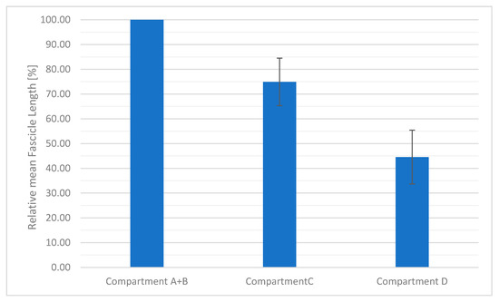 All data are presented as mean ± SD. Mean fascicle length of all animals was 65.09 ± 24.71 mm with a minimum length of 12.47 mm and a maximum length of 202.19 mm. Fascicle length showed the highest values in the cranial compartments (A + B) and decreased from cranial to caudal. Compartment A + B with the longest fascicle length was set to 100%. The middle part of muscle compartment C showed 74.93 ± 9.6% compared to the fascicle length in compartment A + B. In compartment D, fascicle length was less than half of the length (44.53 ± 10.86%) of the fibre bundle length in compartment A + B (see Figure 5).