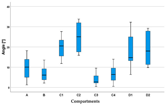 Pennation angles to the sagittal plane calculated for each compartment A–D and sub-compartment C1–C4 and D1 and D2. Angles above zero degrees describe fascicle orientation in a medial direction to the spine. The boxplot or box and whisker plot depicts the quartiles (2 quartiles in the box and 2 out of the box indicated by the whiskers) and the median (bold line in the box) of the distribution.