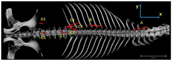 Dorsal view of a rendered CT bone model of a horseback. Red lines demonstrate the orientation (to the sagittal plane) of one representative fascicle for each compartment and sub-compartment (yellow letters) for the left longissimus dorsi muscle.