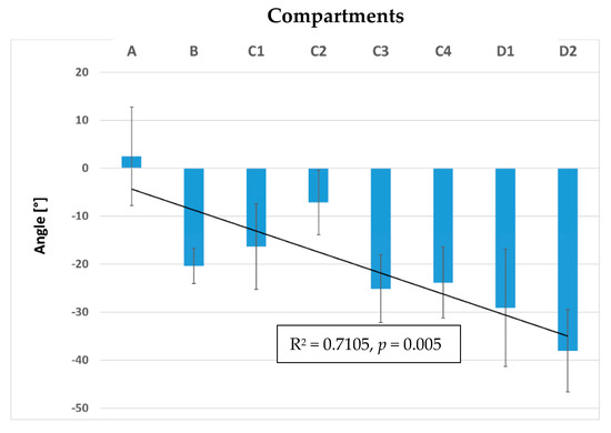 Mean pennation angles of the longissimus dorsi muscle to the horizontal plane calculated for each compartment A–D and sub-compartments C1–C4 and D1 and D2. Compared to cranial compartment A, the pennation angles to the horizontal plane change the orientation and get steeper in the caudal direction (see significant linear regression, R2 = 0.71, p = 0.005), with the lowest values found in compartment D.