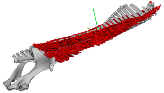 The model of the longissimus dorsi muscle based on the fibre digitalisation of the study. The model was used to simulate muscle activity within OpenSim software.