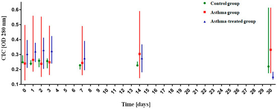 The analysis of changes over time showed that there was a significant decrease in the OD280 mm absorbance at the T30 point in the asthma-treated group from T0 median = 0.304 (q1 = 0.211, q3 = 0.397) to T30 median = 0.151 (q1 = 0.133, q3 = 0.185) (p < 0.001)) as well as a significant increase in the OD280 mm absorbance in T30 in the untreated group from T0 median = 0.240 (q1 = 0.127, q3 = 0.498) to T30 median = 0.332 (q1 = 0.175, q3 = 0.614) (p = 0.016)). In the control group, a significant decrease in the CIC was noted already at T7: from T0 median = 0.248 (q1 = 0.246, q3 = 0.295) to T7 median = 0.228 (q1 = 0.2, q3 = 0.235) with (p = 0.004), to T14 (p = 0.0302) and T30 (p = 0.0288). The results are presented in Figure 2.