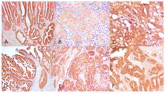 HER2 positivity in canine carcinomas, all cases displaying 3+ positivity characterized by complete and intense circumferential staining of the cell membrane. (A) Rectal carcinoma, (B) Oral Squamous cell carcinoma, (C) Gastric carcinoma; (D) Urothelial transitional cell carcinoma, (E) Prostatic carcinoma; (F) ovarian carcinoma. Avidin-biotin-peroxidase method, counterstained with Papanicolaou’s hematoxylin, 10×.