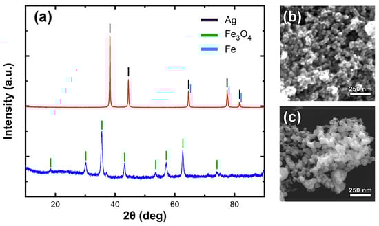 The composition and morphological characteristics of the tested nanoparticles were validated by means of XRD and FE-SEM analysis. Figure 1 shows the identification of Fe3O4 and Ag as the major phases in each nanoparticle system. Due to the similarity of the expected peaks for Ag and Fe, the presence of the small percentage of iron in the second sample is only indicated by the side peaks observed at high-angle peaks. Electron microscopy images (Figure 1b,c) demonstrate the presence of spherical nanoparticles in both cases with an average size range around 30–40 nm.