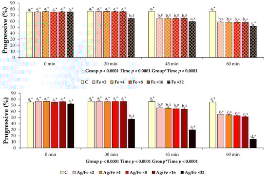Post treatment progressive motility of liquid extended ram semen samples (n = 8) co-incubated (15 °C) with different concentrations of Fe3O4 and Ag/Fe nanoparticles (NPs) for 0, 30, 45, or 60 min. Control group (C): Extended ram semen samples-no treatment; iron oxide groups (Fe): Extended ram semen supplemented with different concentrations of Fe3O4 NPs (Fe ×2, Fe ×4, Fe ×8, Fe ×16, Fe ×32 correspond to 0.384 mg, 0.768 mg, 1.536 mg, 3.072 mg, and 6.144 mg of Fe3O4 NPs/mL semen, respectively); silver groups (Ag/Fe): Extended ram semen samples supplemented with different concentrations of Ag/Fe NPs (Ag/Fe ×2, Ag/Fe ×4, Ag/Fe ×8, Ag/Fe ×16, Ag/Fe ×32 corresponds to 0.256 mg, 0.512 mg, 1.024 mg, 2.048 mg and 4.096 mg of Ag/Fe NPs/mL semen, respectively). Values are expressed as LSmeans ± standard error of the mean (SEM). Differences at statistical level between groups are noticed by different superscripts (a, b, c, d). Significant differences between evaluation times within each experimental group are depicted by different symbols (*, #, +, ^).