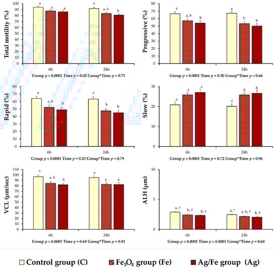 According to the results of the CASA motility variables, differences were observed between the control and the treated groups. At 6 h of storage at 15 °C, the values of progressive (p = 0.027) and rapid (p = 0.017) movement spermatozoa, VCL (p = 0.018), and ALH (p = 0.0003) of group Ag were lower compared to group C (Figure 3). At the same time point, a similar situation was noticed for ALH (p = 0.003) between the Fe and C groups (Figure 3). In group Ag, the values of total motility (p = 0.015) and ALH (p = 0.006) were less compared to group C at 24 h of storage (Figure 3). In both NPs treated groups, decreased values of progressive and rapid movement spermatozoa (p < 0.05) were recorded after 24 h of storage compared to group C, while the values of slow movement spermatozoa (p < 0.05) were increased (Figure 3).