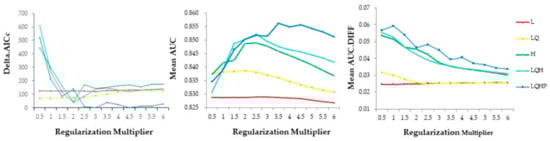 The delta.AICc, mean AUC, and mean AUC.DIFF metrics resulting from Maxent models made across 5 feature class and 12 regularization multiplier combinations. The left panel shows delta.AICc; the center panels show mean AUC, and the right panel shows the mean difference between training and testing (AUC.DIFF) data. L = linear, Q = quadratic, H = hinge, P = product.