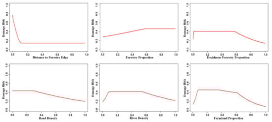 Distance to the forest edge and forest proportion were the most important factors influencing wild boar damage, followed by deciduous forest proportion, road density, river density, and farmland proportion. These six factors contributed 86.1% to the LQHP 4.5 model. (Table 1). Response curves of these six factors to damage risk are shown in Figure 2. Distance to the forest edge and road density were negative factors affecting wild boar damage risk, with forest proportion having a positive influence. River density, deciduous forest, and the proportion of farmland recorded a piecewise response pattern. The level of risk was raised at the low value range of those factors, after which it was maintained at a high level in the low to medium values, before finally decreasing with high values.