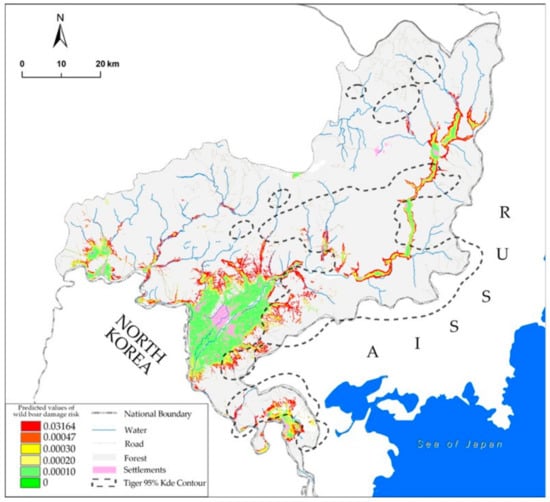 Hunchun, a typical area suffering wild boar (Sus scrofa) damage, is an important region for the Siberian Tiger (Panthera tigris) in China. By incorporating the maximum entropy model with 22 variables in the home range scale (12 variables) and in the feeding site scale (10 variables), we predicted wild boar damage risks in this area of China and analyzed how spatial factors influence damage risk. Damage risk was found to be high in areas close to the forest edge, areas with a higher forest cover and lower to medium deciduous forest proportion, low road density, and a medium river density and farmland proportion. The proportion of farmland which was identified as being in the high damage risk zone was 23.55%, of which 38.68% was within the habitat area of the Siberian Tiger. Finally, we propose wild boar damage prevention based on different management goals.