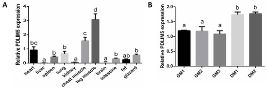 The expression of PDZ and LIM domain 5 (PDLIM5) in different chicken tissues and chicken skeletal muscle satellite cells (SMSCs). (A) The expression of PDLIM5 in 11 different chicken tissues determined by qPCR (heart as the control group, n = 9). (B) The expression of PDLIM5 in chicken SMSCs at different time points determined by qPCR (n = 3). a,b,c,d p < 0.05.