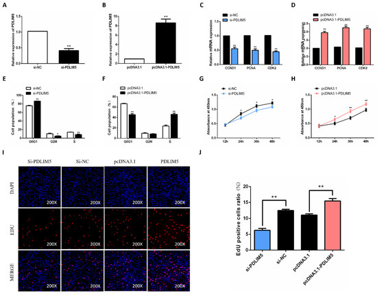PDLIM5 increased proliferation of chicken SMSCs. The mRNA expression of PDLIM5 in cells that transfected with si-RNA (A) or plasmid (B). After 48 h of PDLIM5 inhibition (C) or overexpression (D), qPCR was used to detect SMSC proliferation-related genes. Cell cycle analysis of SMSCs after inhibition (E) or overexpression (F) of PDLIM5 for 48 h. (G,H) After overexpressing PDLIM5 or inhibiting PDLIM5 in SMSCs, the cell proliferation activity was measured using CCK-8 kit. (I,J) The EdU fluorescence (red) was considered the proliferation indicator, and the cell nuclei were represented by DAPI (4’,6-diamidino-2-phenylindole, blue) fluorescence. The ratio of EdU-positive cells was determined when PDLIM5 was overexpressed or inhibited. * p < 0.05; ** p < 0.01 vs. NC and pcDNA3.1 (negative control). (n = 9).