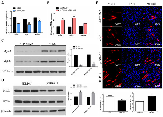 PDLIM5 increased chicken SMSCs differentiation. (A,B) Gene expression of myosin heavy chain (MyHC), myogenic differentiation 1 (MyoD), and myogenin (MyoG) in SMSCs after overexpression or knockdown of PDLIM5. (C,D) Protein abundance of MyHC and MyoD in SMSCs after overexpression or knockdown of PDLIM5. (E) The immunofluorescence pictures and myotube area statistics of SMSCs after overexpression or knockdown of PDLIM5. In the picture, red represents myosin and blue represents stained nuclei. * p < 0.05; ** p < 0.01 vs. NC and pcDNA3.1 (negative control) (n = 9).