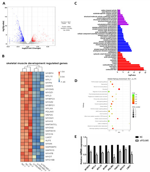 Interfering with transcriptome sequencing of si-PDLIM5 and negative control cells. (A) Volcano plot of statistically up-regulated or down-regulated genes after transcriptome analysis. (B) A heat map obtained by clustering analysis of differentially expressed genes that related to muscle development. (C) Analysis of differentially expressed genes by GO enrichment. (D) Analysis of the related pathways by KEGG enrichment. (E) Verification of mRNA expression of muscle development-related genes in transfected si-PDLIM5 or control. * p < 0.05; ** p < 0.01 relative to NC (negative control) (n = 9).