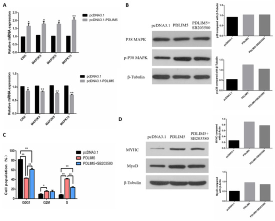 According to the results of the transcriptome, it was found that after knocking down PDLIM5, the expression of MAPK13 (p38-MAPK) decreased, and KEGG was enriched in the MAPK signaling pathway. Therefore, we then explored whether PDLIM5 regulated the development of SMSCs through the p38-MAPK pathway. First, we verified the differentially expressed MAPK pathway genes in transcriptome sequencing. The qPCR results showed that gene expression changes were consistent with transcriptome results (Figure 5A). After overexpression of PDLIM5, the total p38 protein (t-p38) and phosphorylated p38 protein (p-p38) were measured through Western blot. The p-p38 protein expression was increased, while the level of t-p38 remained unchanged. However, after adding a specific p38-MAPK inhibitor (SB203580) to PDLIM5-transfected cells, the activation of p-p38 was alleviated (Figure 5B). After adding exogenous PDLIM5, the ratio of G0/G1 phase cells decreased and increased in S phase, and the protein abundance of MyHC and MyoD increased. However, after adding SB203580 to PDLIM5 transfected cells, these effects were reduced (Figure 5C,D). These results indicate that PDLIM5 regulates SMSC proliferation and differentiation via the p38-MAPK signaling pathway.