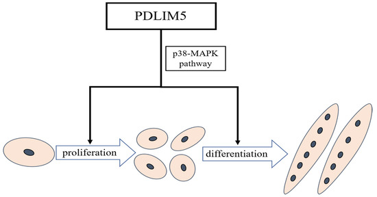 In summary, we have demonstrated that PDLIM5 can promote chicken SMSC proliferation and differentiation. Transcriptome sequencing found that knocking down PDLIM5 can reduce the expression of many muscle-development-related genes, such as MYBPH, MYH15, and MEF2C. In addition, we further verified that PDLIM5 can promote muscle development through the p38-MAPK pathway (Figure 6). These results can help us to detect more functions of PDLIM5 and even genes containing PDZ and LIM domains in myogenesis.