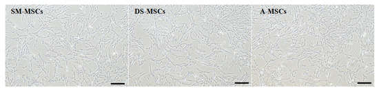 Cellular morphology of mesenchymal stem cells (MSCs) derived from skeletal muscle (SM-MSCs), dermal skin (DS-MSCs), and adipose tissue (A-MSCs) was observed at passage three by phase-contrast microscope. Scale bar = 100 µm.