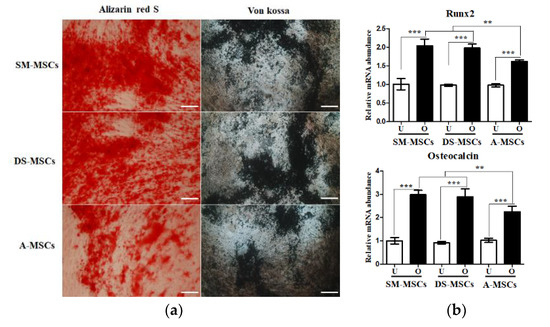 The results of in vitro osteoblast differentiation of MSCs derived from skeletal muscle (SM-MSCs), dermal skin (DS-MSCs), and adipose tissue (A-MSCs). (a). Cytochemical staining of differentiated osteoblasts. Scale bar = 200 µm. (b). Results of RT-qPCR for osteoblast-specific markers in differentiated cells. All osteoblast-specific markers were significantly higher in differentiated osteoblast from SM-MSCs and DS-MSCs than that from A-MSCs. Data are represented by the mean ± SD of four independent experiments. Asterisks indicate significant difference between the undifferentiated cells and differentiated cells (** p < 0.01; *** p < 0.001). White bar: undifferentiated cells; black bar: differentiated cells; U: undifferentiated cells; O: osteogenic differentiated cells.