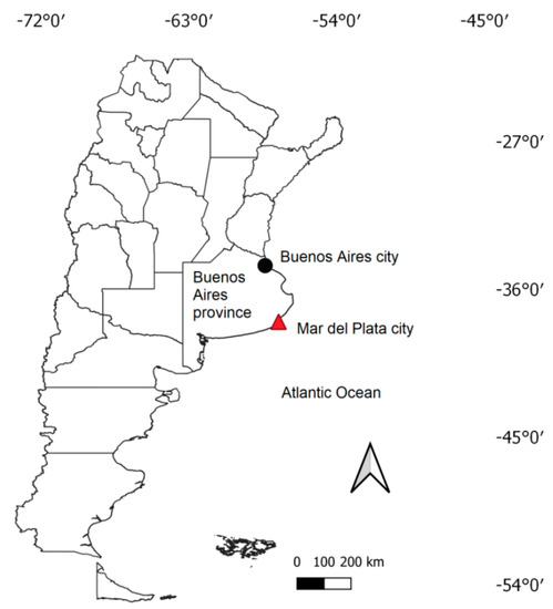 Location of Buenos Aires province, Buenos Aires city, and Mar del Plata city in Argentina.