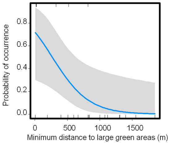 In Buenos Aires city, the best model included Dist2 as the best variable related to Harris Hawk occurrence in green areas (pseudo r2 = 0.32; LRT = 7.93, p = 0.005; Table 2; Figure 2). Therefore, Harris Hawk occurrence was positively associated with green areas connected to large green areas (Figure 2).