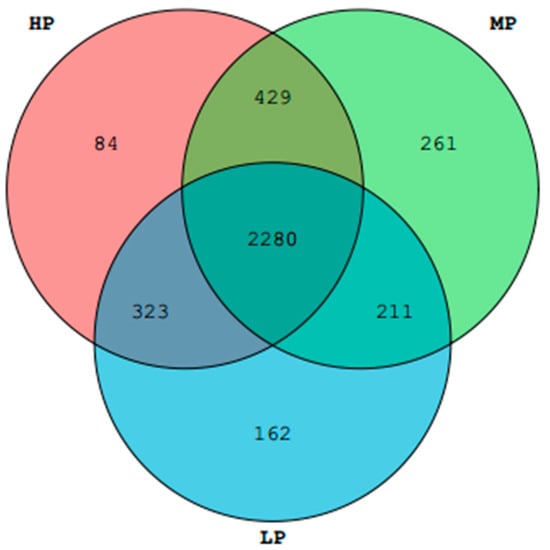 As shown in Table 4, a total of 1,100,104 sequences were obtained from all samples, and the maximum number of sample sequences was 71,516, and the minimum was 52,611. A total of 3750 OTUs were generated for the three dietary protein level groups. As shown in Figure 1, there were 2280 (68.80%) common OTUs among the three groups. Furthermore, there were 2709 (75.50%) common OTUs between the HP and MP groups, 2491 (67.95%) common OTUs between the LP and MP groups, and 2603 (68.28%) common OTUs between the HP and LP groups. All raw sequences are available in the NCBI Sequence Read Archive under BioProject ID: PRJNA700685.