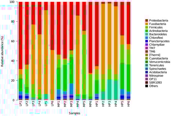 On the level of phylum, in all groups, Proteobacteria, Fusobacteria and Firmicutes were the dominant phyla, comprising 80% of the total phyla in the intestine, as shown in Figure 2. The proportion of Proteobacteria was similar across fish in the MP group, whereas that of Fusobacteria was higher in the LP and HP groups but lower in the remaining group. The proportions of other phyla, such as Actinobacteria and Bacteroidetes, varied across different individuals and accounted for smaller proportions.