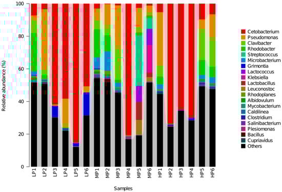 At the genus level, in all groups, the proportion of Cetobacterium, Pseudomonas, Unclassified Clostridiaceae, Unclassified Rhizobiales, Clavibacter were the top five, accounting for about 60% of the total. Furthermore, the proportion of Cetobacterium was higher in the LP and HP groups but lower in the remaining group. Other genera, such as Pseudomonas, the order Rhizobiales, and the family Clostridiaceae, accounted for certain proportions (Over 6% on average) in the three groups, and there were differences among different individuals, as shown in Figure 3.
