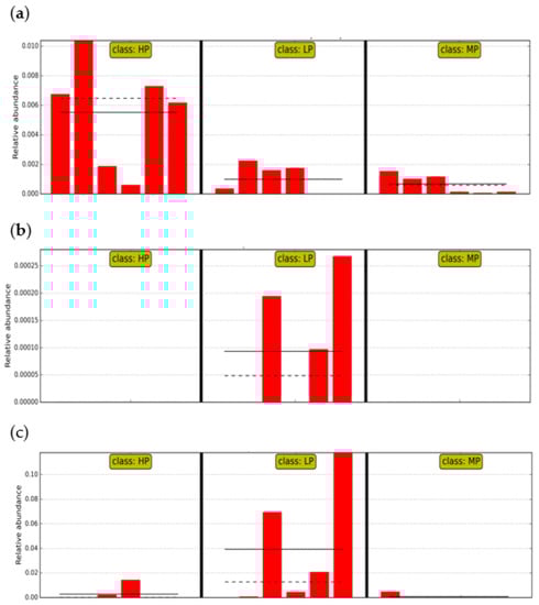 Through LEfSe analysis, the abundance of Clostridium was found to be significantly higher in the HP group, the abundance of Enterovibrio and Grimontia were significantly higher in LP (p < 0.05), at the genus level, and there was no significant difference at the phylum level (p > 0.05), as shown in Figure 4.