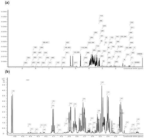 NMR spectrum of tilapia liver and serum. (a) NMR spectrum of tilapia liver. 1.2-Hydroxybutyrate; 2: 4-Aminobutyrate; 3: Acetate; 4: Alanine; 5: Asparagine; 6: Aspartate; 7: Cholate; 8: Choline; 9: Creatine; 10: Creatinine; 11: Cytidine; 12: Fumarate; 13: Glucose; 14: Glutamate; 15: Glutamine; 16: Guanosine; 17: Histidine; 18: Hypoxanthine; 19: IMP; 20: Inosine; 21: Isoleucine; 22: Lactate; 23: Leucine; 24: Lysine; 25: Malate; 26: Maltose; 27: Mannose; 28: beta-Alanine; 29: Methionine; 30: Nicotinurate; 31: O-Phosphocholine; 32: Pantothenate; 33: Phenylalanine; 34: Proline; 35: Serine; 36: Succinate; 37: Taurine; 38: Threonine; 39: Tryptophan; 40: Tyrosine; 41: Uracil; 42: Urea; 43: Uridine; 44: Valine; 45: sn-Glycero-3-phosphocholine. (b) NMR spectrum of tilapia serum. 1: 1;6-Anhydro-β-D-glucose; 2: 2-Hydroxybutyrate; 3: 2-Hydroxyisobutyrate; 4: 3-Hydroxybutyrate; 5: Acetate; 6: Alanine; 7: Arginine; 8: Betaine; 9: Choline; 10: Citrate; 11: Creatine; 12: Creatinine; 13: Cytidine; 14: Dimethylamine; 15: Ethanol; 16: Formate; 17: Fumarate; 18: Glucose; 19: Glutamine; 20: Glycine; 21: Guanosine; 22: Hypoxanthine; 23: Inosine; 24: Isobutyrate; 25: Isoleucine; 26: Lactate; 27: Leucine; 28: Lysine; 29: Mannose; 30: tau-Methylhistidine; 31: Methionine; 32: Pantothenate; 33: Phenylalanine; 34: Proline; 35: Pyruvate; 36: Sarcosine; 37: Serine; 38: Succinate; 39: Threonine; 40: Trimethylamine N-oxide; 41: Tryptophan; 42: Tyrosine; 43: Uracil; 44: Uridine; 45: Valine; 46: myo-Inositol; 47: trans-4-Hydroxy-L-proline.
