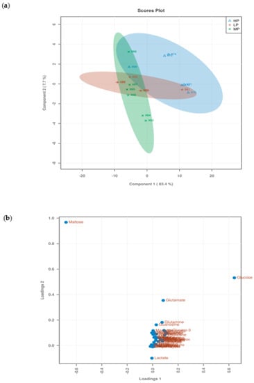 From the PLS-DA score plots of the metabolite in the serum (Figure 8a), there was no difference in metabolites between each of the LP, MP, and HP groups, respectively. However, the LP, MP, and HP groups showed a trend of separation, and the metabolites among the three groups were very different. From the PLS-DA loading plots of the metabolite in the liver (Figure 8b). Most of the data were clustered near the original place, and a few of the data points were relatively discrete, indicating differences in metabolites between the three groups. The PLS-DA permutation test of serum data indicates that the classification by the PLS-DA model was good (p = 0.003) (Figure 9).