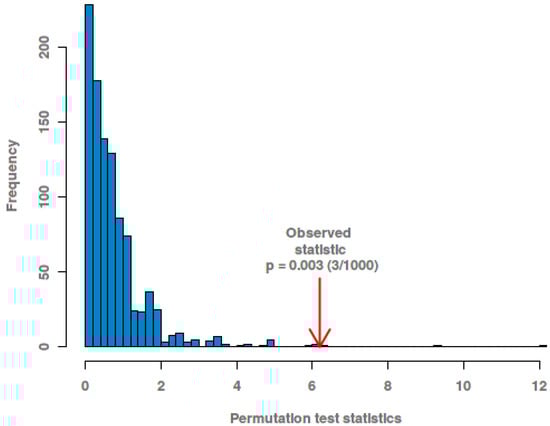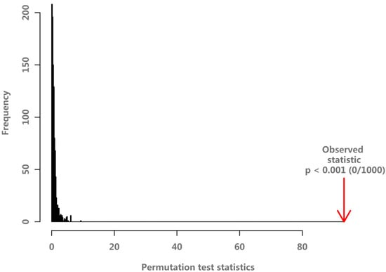 In the PLS-DA score plots of the metabolite in the liver (Figure 6a), there were few differences in metabolites in each LP, MP, and HP groups, respectively. However, the LP, MP, and HP groups showed a trend of separation, and the metabolites among the three groups were different. From the PLS-DA loading plots of the metabolite in the liver (Figure 6b), Most of the data points were clustered near the origin, and only a small number of data points, such as glucose and maltose, were scattered. The contribution rate of metabolites such as glucose and maltose to the inter-group differentiation of samples is large. The PLS-DA permutation test of the liver data indicates that the classification by the PLS-DA model was good (p = 0.003) (Figure 7).