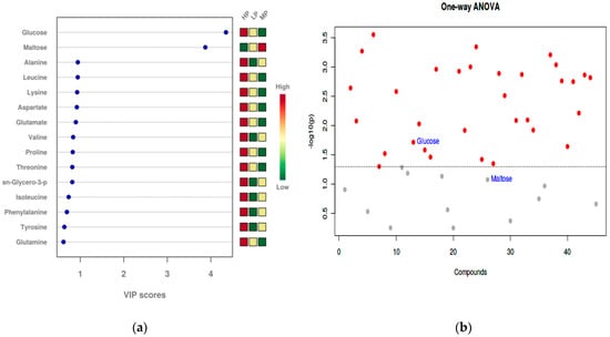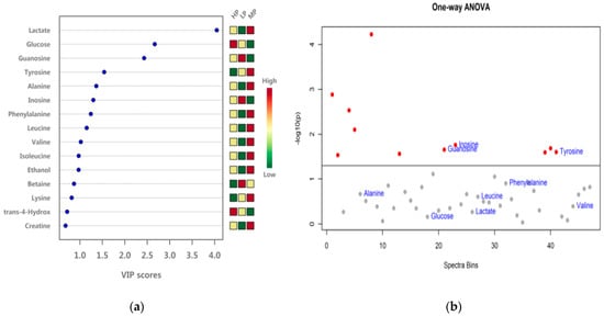 Metabolites VIP Analysis and ANOVA test of metabolites (VIP > 1) in serum. (a) Metabolites VIP Analysis; (b) one-way ANOVA test of metabolites (VIP > 1). Metabolites above the dotted line had significant differences.