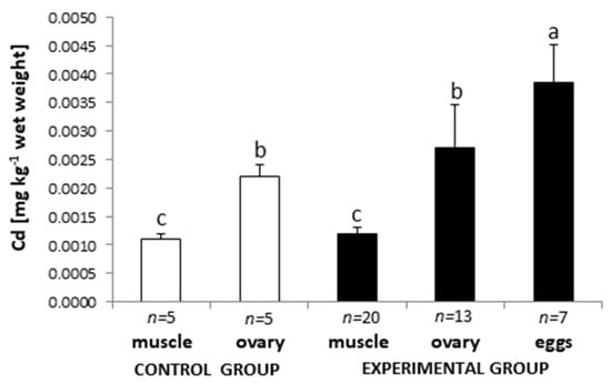 This is the first study of the cadmium content in female eel tissues including ovulated eggs. The dynamics of cadmium in muscle, gonads, and eggs during maturation under controlled conditions were also noted. It was found that the level of cadmium was higher in ovaries than in muscles, which may indicate its active transport from tissues to gonads. Unfortunately, the highest content of this heavy metal was observed in eggs (after ovulation), which, consequently, may have a negative impact on the fertilization process, embryonic development, and embryo survival rate.