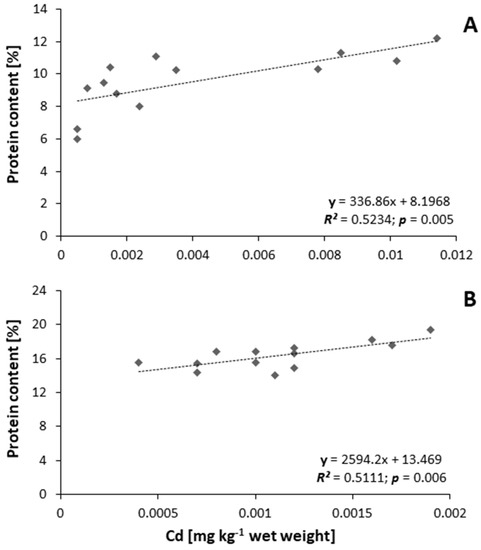 Relationship between percentage content of protein and content of cadmium in ovaries (A) and muscles (B) of silver European eel Anguilla anguilla (n = 13).