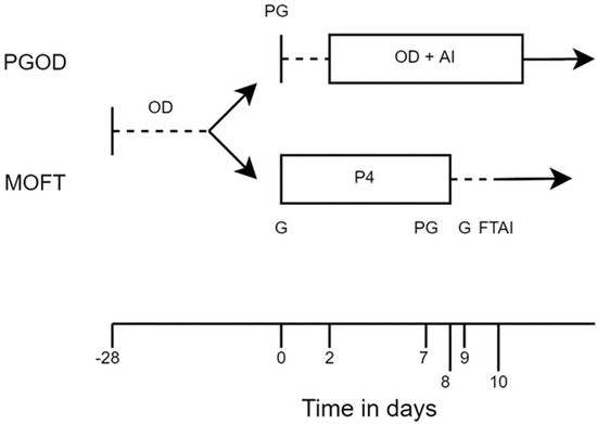 Experimental design of a randomized trial to compare the effect of two different treatment protocols (i) PGOD: 0.15 mg d-cloprostenol sodium (PG) intramuscularly at day 0 and insemination (AI) following observed estrus (OD) from day 2 onwards; (ii) MOFT: 100 μg of gonadorelin acetate (G) intramuscularly and an intravaginal device containing 1.38 g progesterone (P4) at day 0, 0.15 mg d-cloprostenol sodium intramuscularly at day 7, removal of the intravaginal device at day 8 and 100 μg of gonadorelin acetate intramuscularly at day 9, 24 h after device removal. Fixed time artificial insemination (FTAI) took place 54 ± 6 h after device removal (10.25 ± 0.25 days); administered to cows not observed in estrus for 28 days prior mating start date at mating start date (day 0).