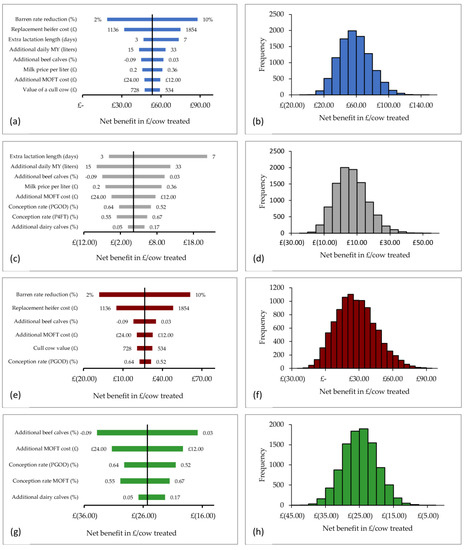 Sensitivity analysis and Monte Carlo simulation showing the influence of input variable uncertainties on the net benefit value in pounds sterling per cow treated; (a,b) herds with a fixed dry-off date and a reduced barren rate; (c,d) herds with a fixed dry-off date but no improvement in barren rate; (e,f) herds with a variable dry-off date and a reduced barren rate; (g,h) herds with a variable dry-off but no improvement in barren rate. X-axis values within brackets represent negative values.