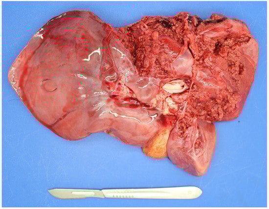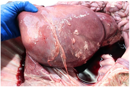 Listeria monocytogenes is not commonly detected in PM studies. It is more commonly detected in suckler than dairy foetuses [38]. As listeria spp. are soil-borne microbes they can cause infection when soil is incorporated with grass in silage pits without adequate anaerobic conditions during fermentation [71]. Both abortion and PM can result due to placentitis and foetal septicaemia with fine hepatic necrotic multifoci (sawdust liver) observed in some cases and occasionally associated hepatic rupture (Figure 2).